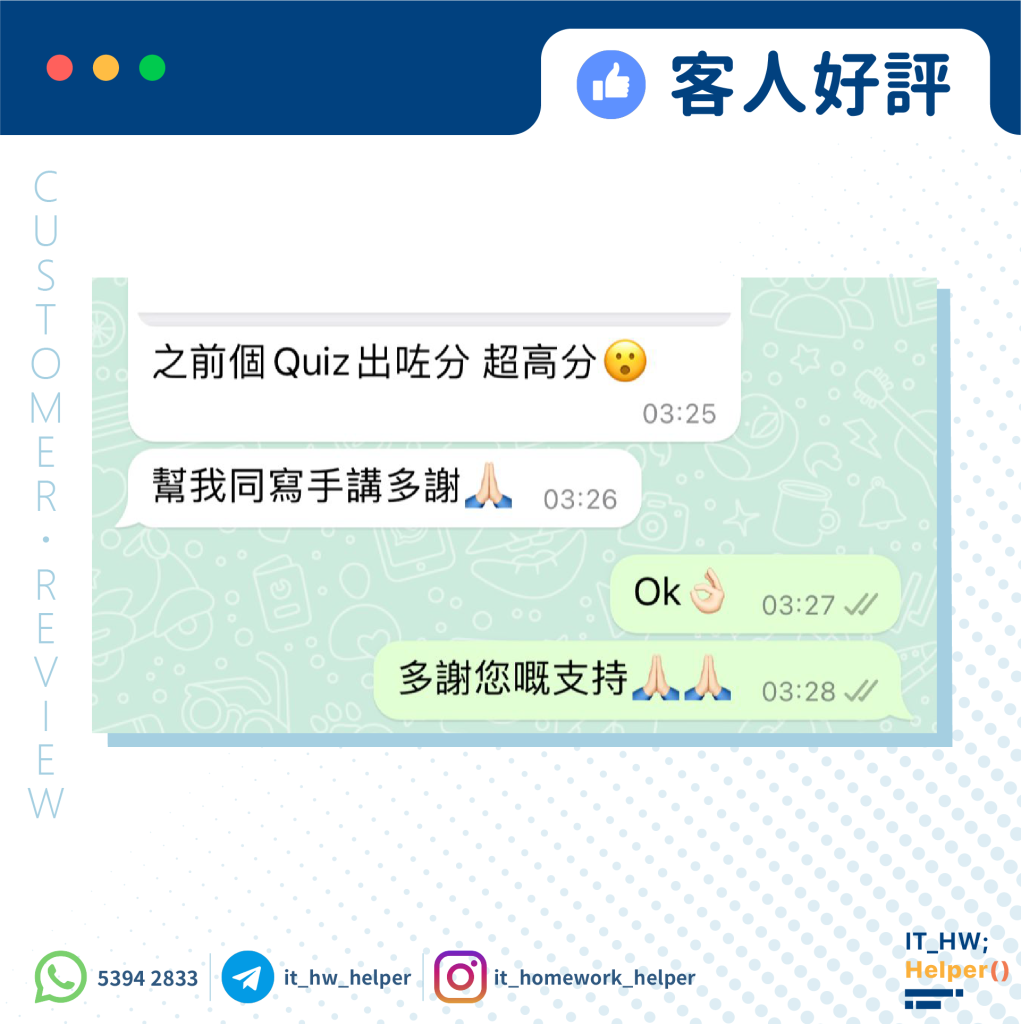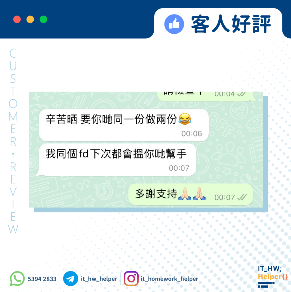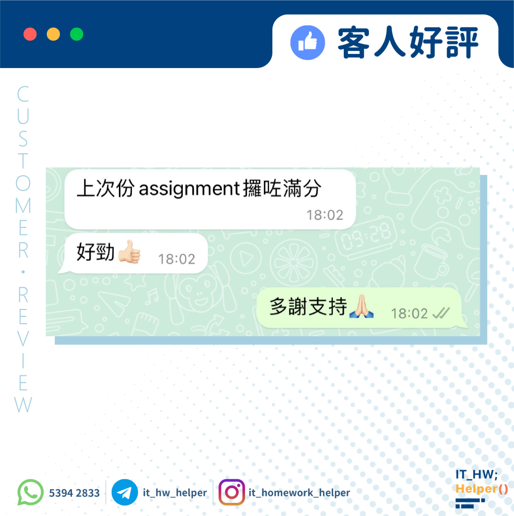 IT Homework Helper是來自香港的專業IT代寫代做平台,專門解決學生在IT學習上的問題。我們能夠代做任何大學大專中學的IT (Information Technology), CS (Computer Science), 電腦科相關的功課, Assignment, Essay, Paper, Project, Lab, Exam, Quiz, 等等。就算是數小時內的急單也歡迎聯絡我們查詢。