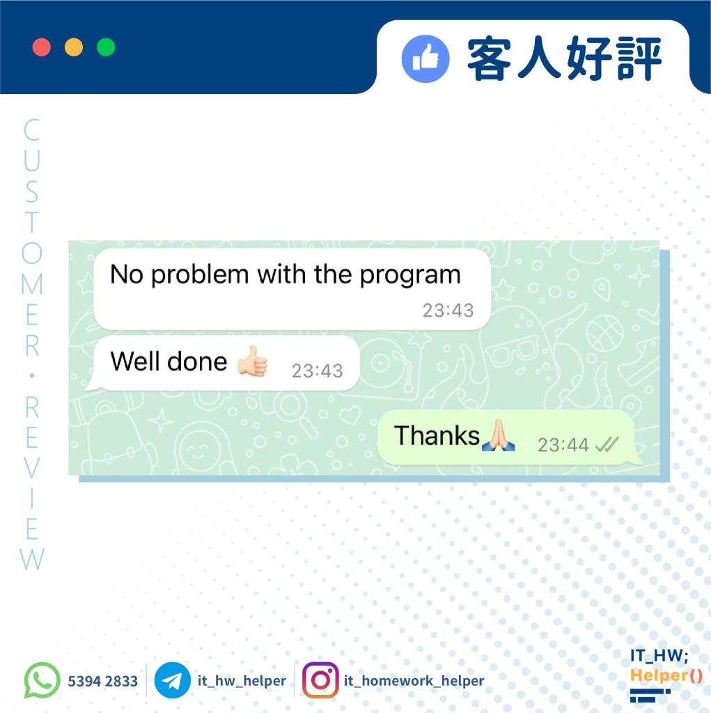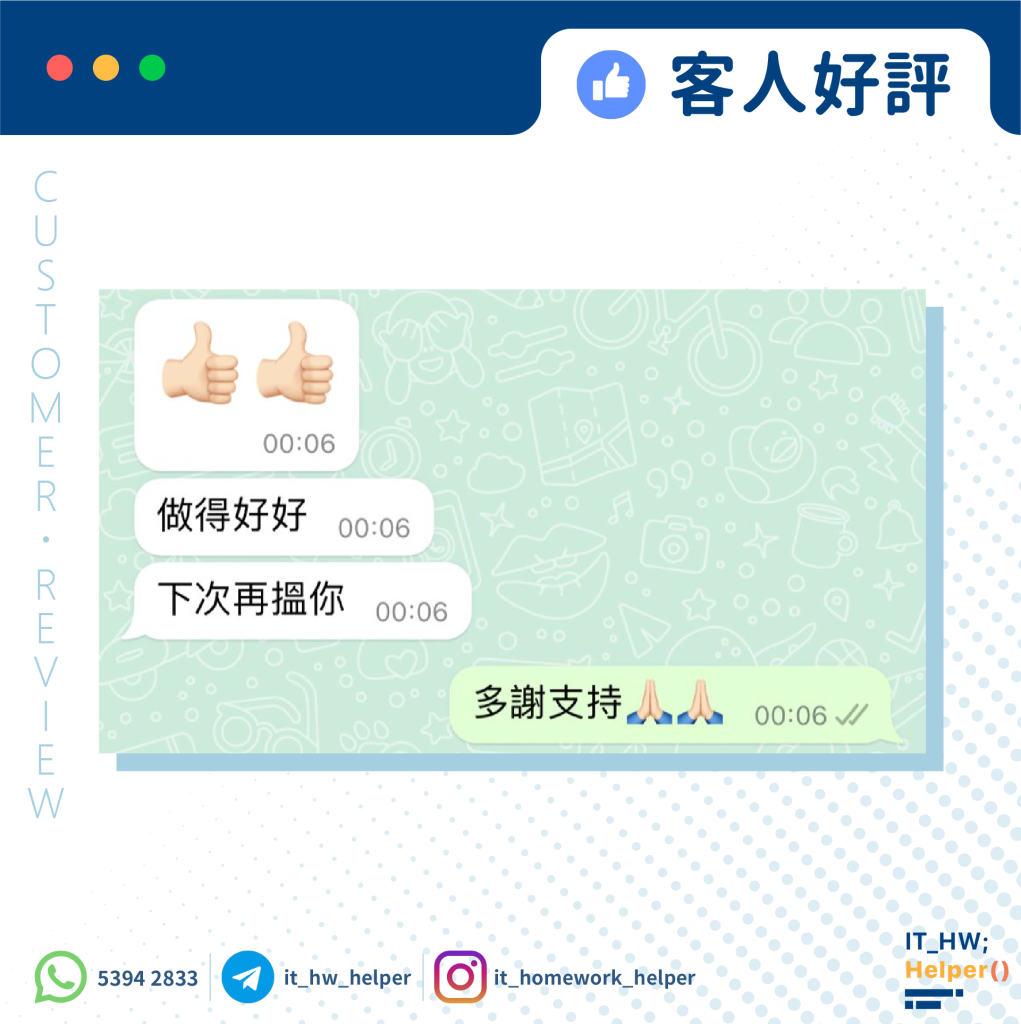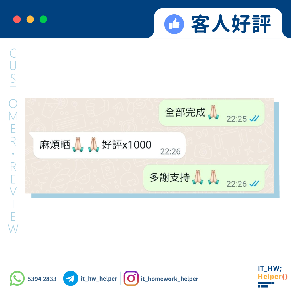 IT Homework Helper是來自香港的專業IT代寫代做平台,專門解決學生在IT學習上的問題。我們能夠代做任何大學大專中學的IT (Information Technology), CS (Computer Science), 電腦科相關的功課, Assignment, Essay, Paper, Project, Lab, Exam, Quiz, 等等。就算是數小時內的急單也歡迎聯絡我們查詢。